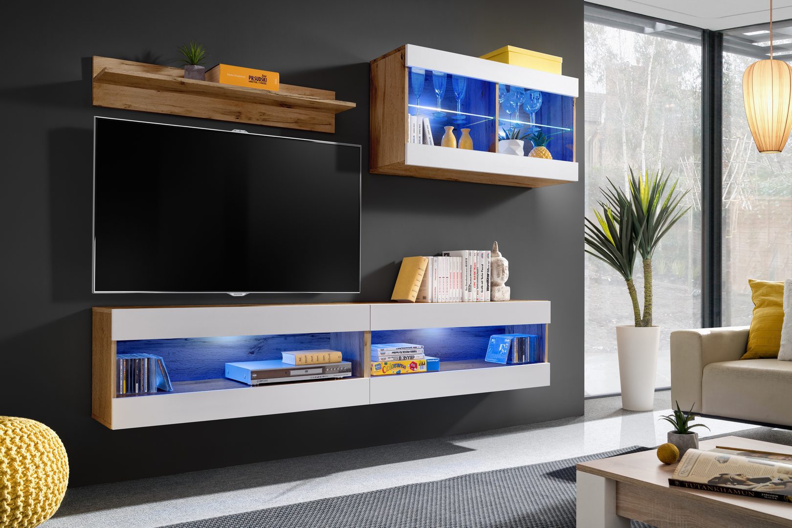 Set, Meubles, Tivoli SET6, Wotan/Blanc, Largeur 200cm x Hauteur 195cm x Profondeur 35cm, LED Bleu, pour Salon, Chambre à coucher