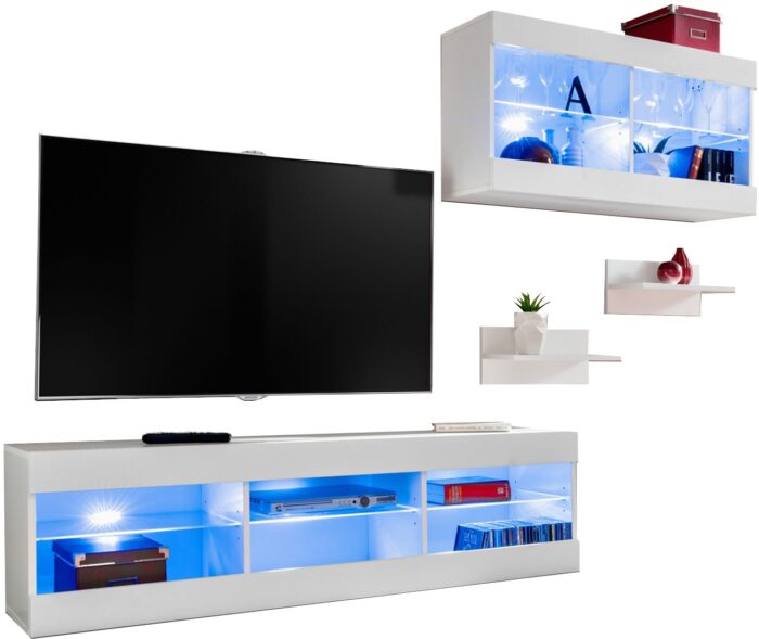 Komodee, Zestaw, Meblościanka, Tivoli SET3, Biały/Biały, Szerokość 240cm x Wysokość 159cm x Głębokość 35cm, LED Niebieskie, do Salonu, Sypialni