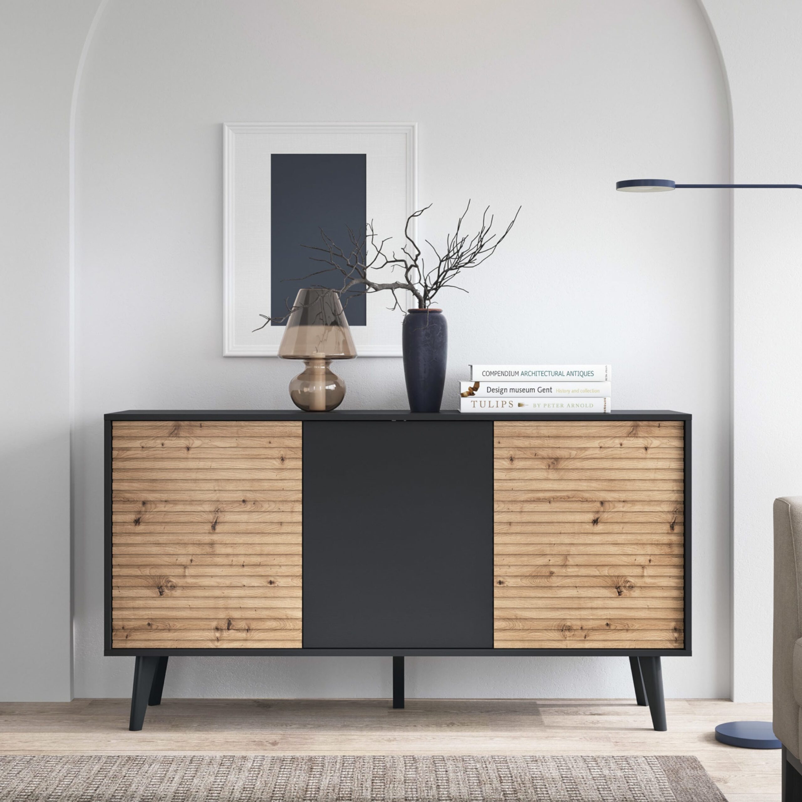 La commode Saskatoon K154 est une solution fonctionnelle et élégante pour le salon, la salle à manger ou la chambre à coucher. Équipé de trois portes, il offre de l’espace pour ranger une variété d’articles, des textiles aux documents ou à la vaisselle. Le duo de couleurs contrastées entre le noir et le chêne artisanal s’harmonise avec la lamelle décorative, soulignant le style industriel du mobilier. Les pieds hauts et noirs ajoutent de la légèreté et facilitent le rangement. Saskatoon K154 est un meuble qui allie design moderne et praticité au quotidien.