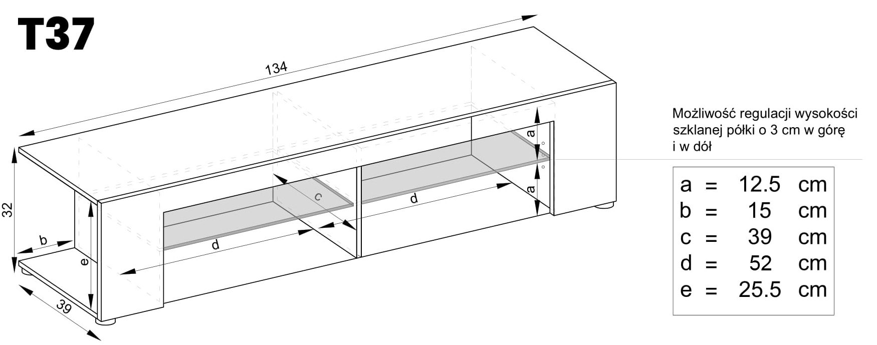 Szafkę wykonano z wysokiej klasy płyty laminowanej, która zapewnia odporność na wilgoć i uszkodzenia. Pozwala również na łatwe utrzymywanie mebla w czystości. Szafka składa się z dwóch półek, dzielących przestrzeń mebla na cztery równe części. Dodatkowa przestrzeń na przechowanie gadżetów znajduje się po bokach mebla, tuż za frontem.