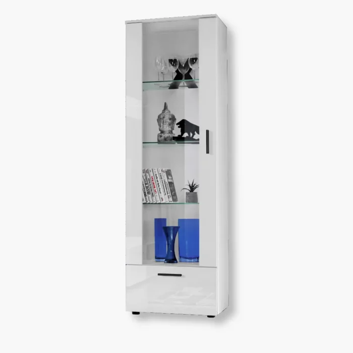 Meubles de salon élégants et fonctionnels avec éclairage LED, différentes couleurs de façade et une construction durable. Parfait pour exposer des souvenirs, des œuvres d’art et stocker des documents, des disques, des livres et de la porcelaine.