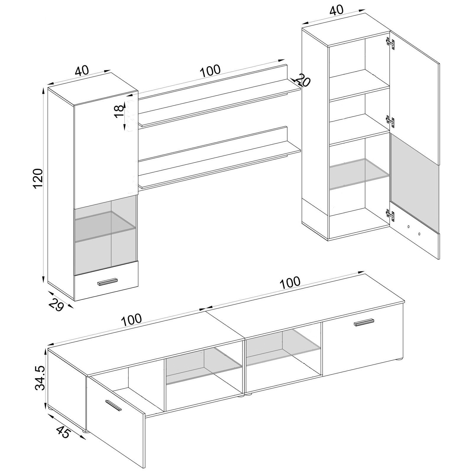 2 wiszące witryny: (wymiary 1 witryny) szerokość 40 cm, wysokość 120 cm, głębokość 29 cm; 3 półki (w tym 1 szklana); drzwi (częściowo przeszklone); opcjonalne oświetlenie LED